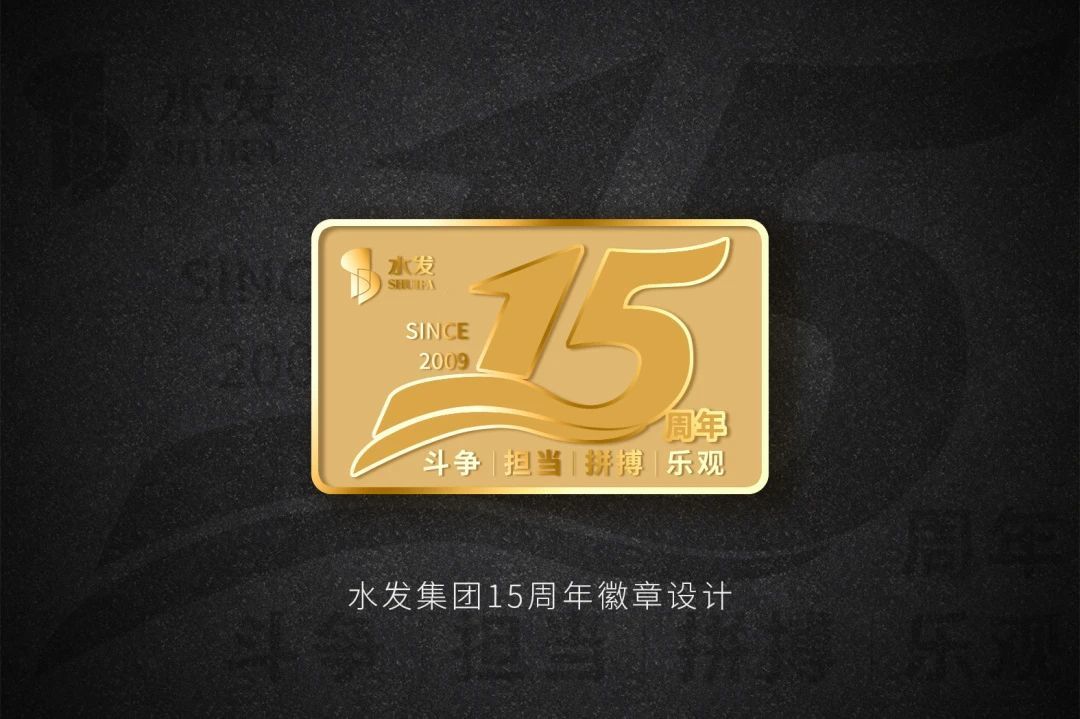 水發(fā)集團(tuán)因水而興,從2009至2024年已走過15個春秋,數(shù)字“15”結(jié)合流動的水來設(shè)計,并結(jié)合了“斗爭、擔(dān)當(dāng)、拼搏、樂觀”的新水發(fā)精神,金色的徽章更顯品質(zhì)。
